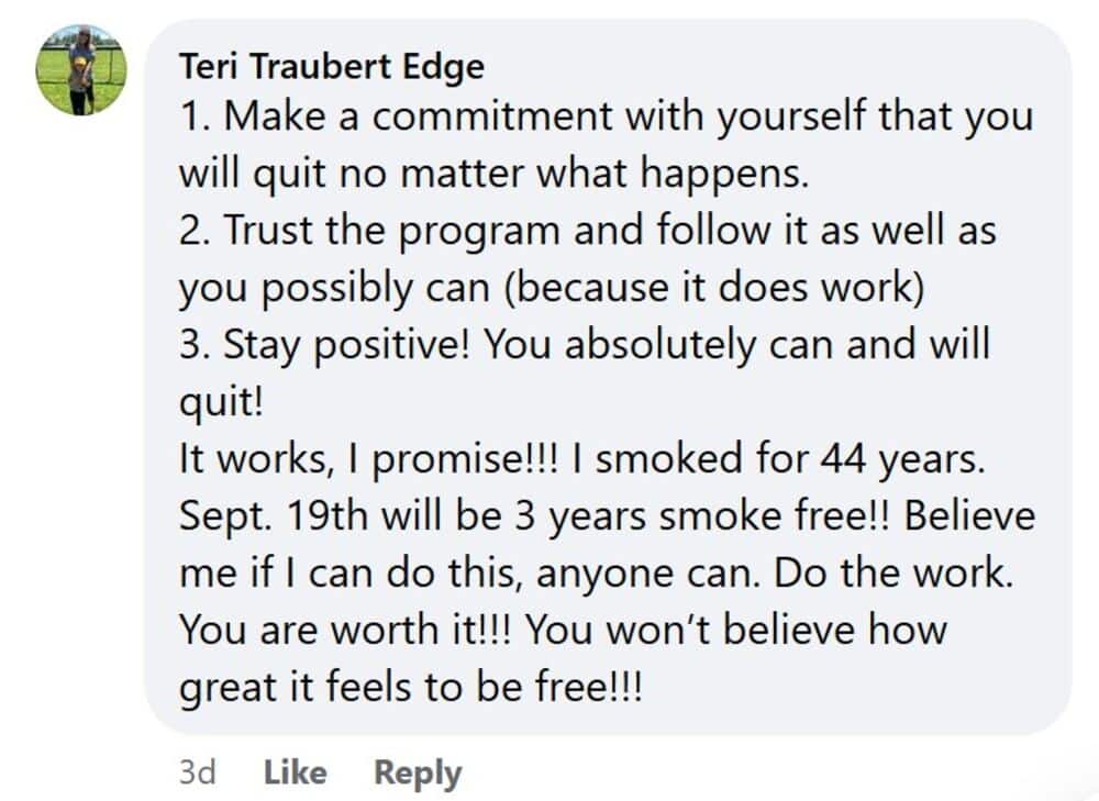It works, I promise!!! I smoked for 44 years. Sept. 19th will be 3 years smoke free!! Believe me if I can do this, anyone can. Do the work. You are worth it!!! You won’t believe how great it feels to be free!!!