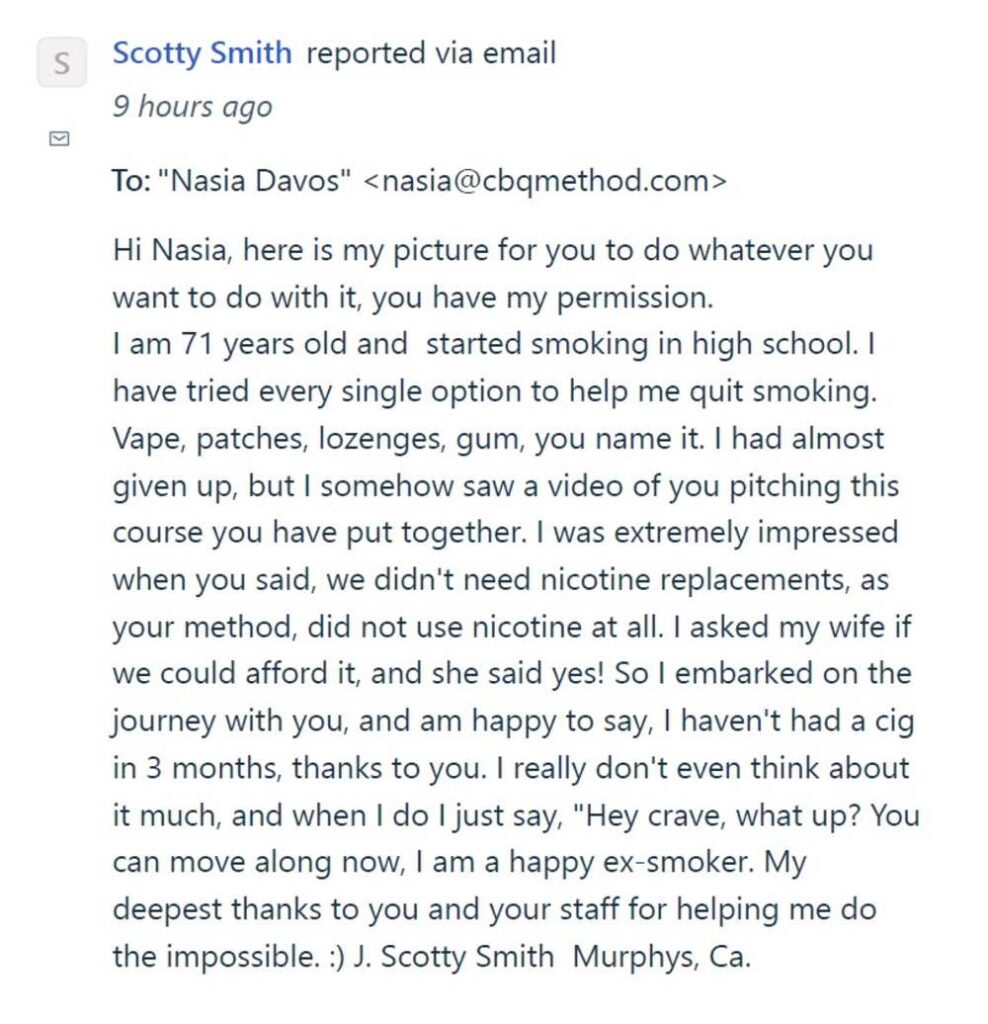 Not only did Scotty quit smoking successfully a year ago… he used the CBQ Program lessons to also quit alcohol and weed 7 months ago!