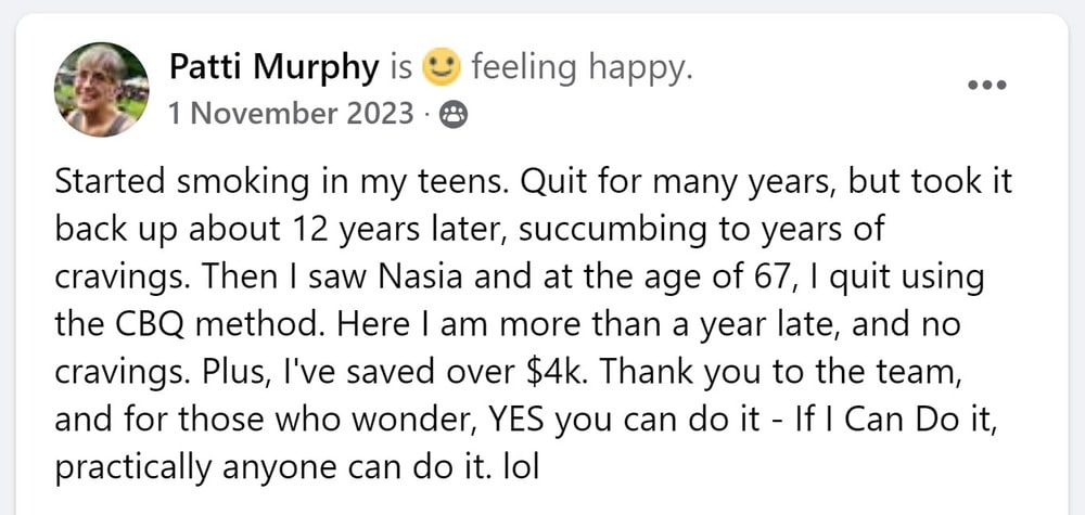 Patti started smoking when she was a teenager, and tried to quit many times. Even though she was able to abstain from smoking, for years at a time, she had constant cravings, which caused her to relapse. After completing the Cognitive Behavioral Quitting (CBQ) Program in two weeks, Patti quit smoking for good!