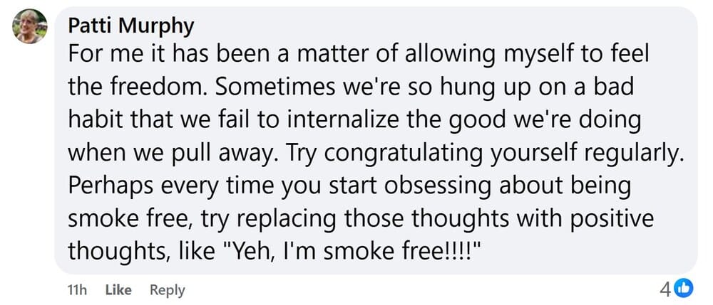 “For me it has been a matter of allowing myself to feel the freedom. Sometimes we’re so hung up on a bad habit that we fail to internalize the good we’re doing when we pull away. Try congratulating yourself regularly. Perhaps every time you start obsessing about being smoke free, try replacing those thoughts with positive thoughts, like “Yeh, I’m smoke free!!!!”
