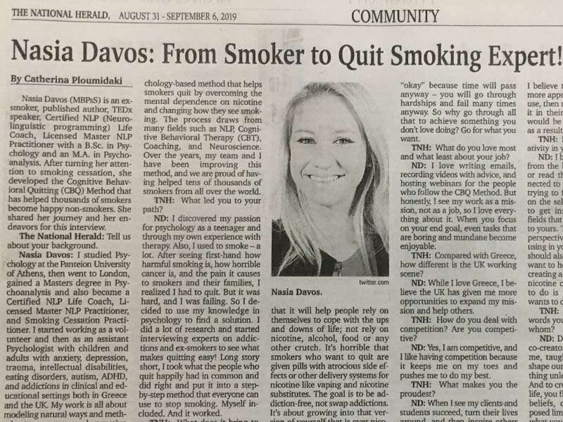 Nasia Davos (MBPsS, IPPA, BSc, MA) used to smoke, and she tried every method available, but nothing worked for her. That’s why she created the CBQ Method.