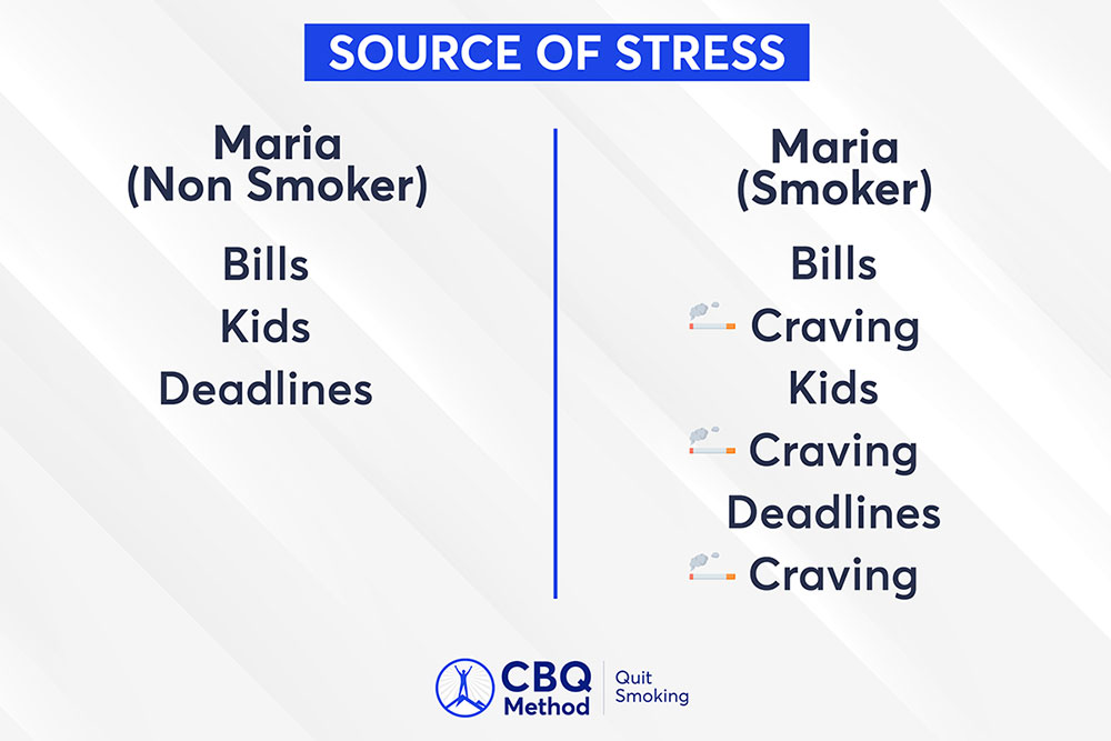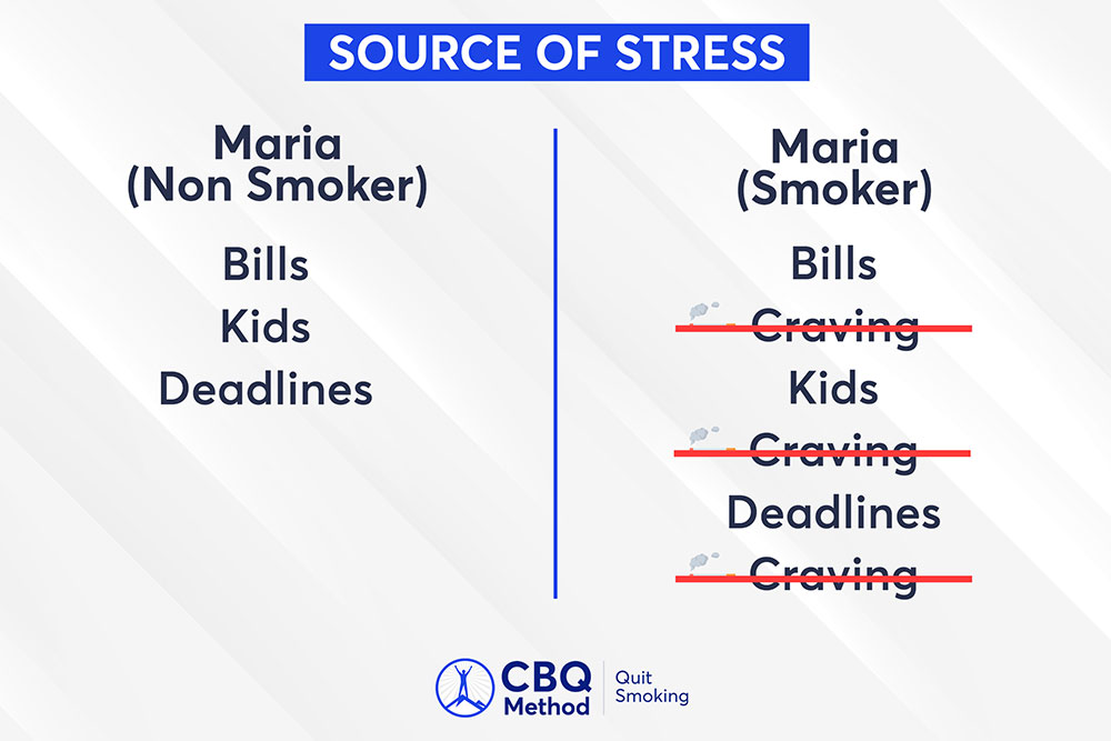 Maria the non-smoker is less stressed than Maria the smoker because she doesn’t have to worry about smoking or feel anxious when her body is low on nicotine.