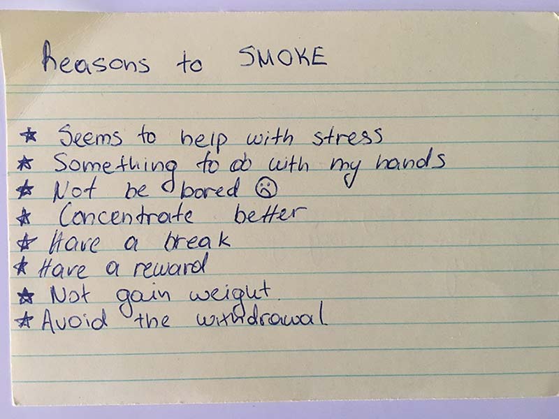On list #2 write ALL the smoking benefits. In other words, the reasons why you want to keep on smoking.