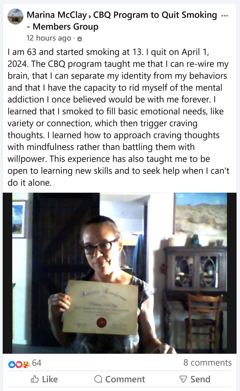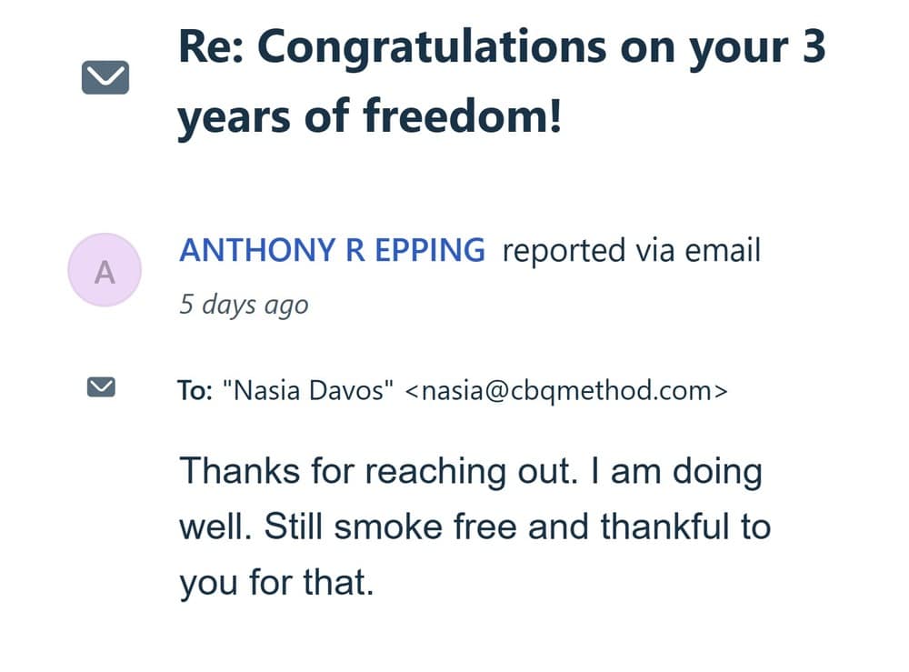 Anthony went through the CBQ Program, at his own pace, and succeeded! He told our community that the “Program is worth every penny!” and 3 years later he’s still a happy non-smoker.