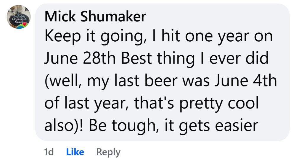 “Keep it going, I hit one year on June 28th Best thing I ever did (well, my last beer was June 4th of last year, that’s pretty cool also)! Be tough, it gets easier”