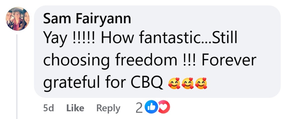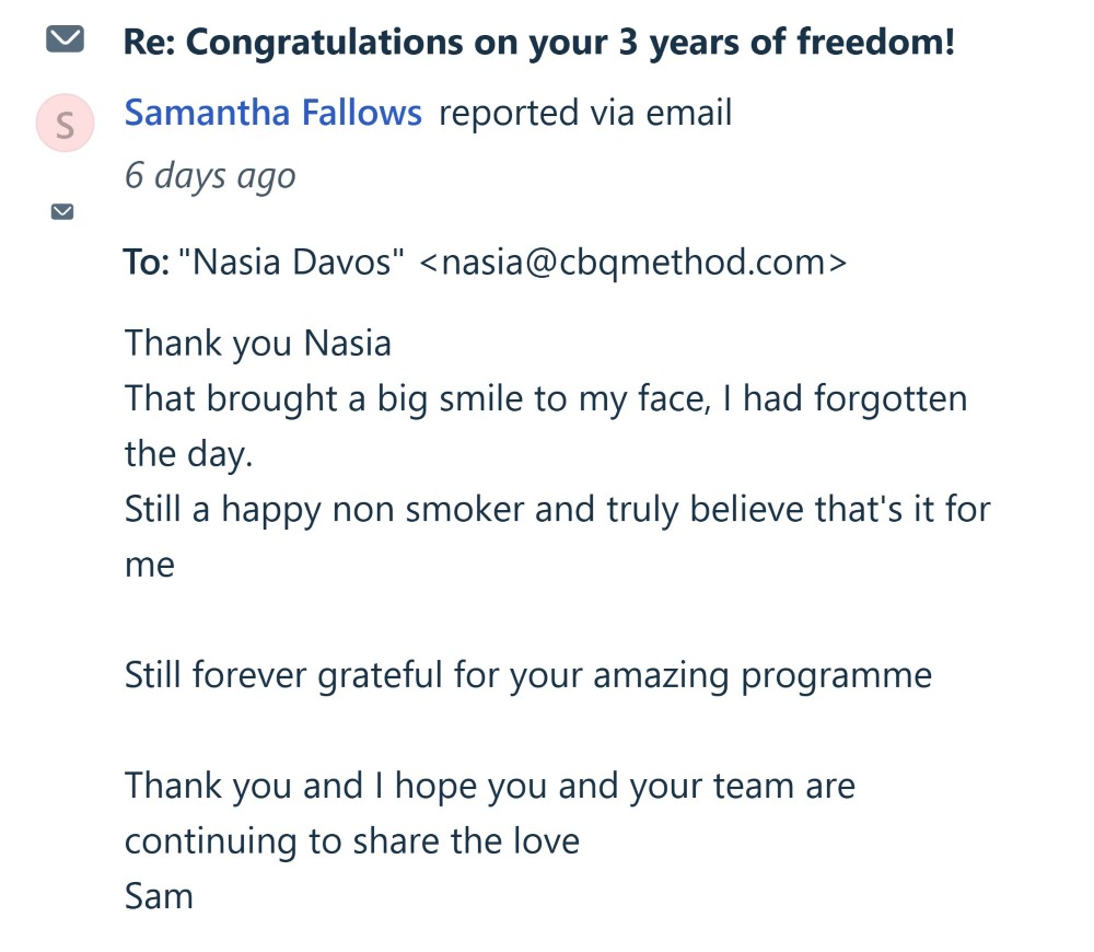 “I am 56 smoked since 13 had a few failed attempts … I chose to stop after completing the course, and I loved all the things CBQ did to help me approach and understand my smoking differently…finally I feel free, huge heartfelt thank you to Nasia and all at CBQ good luck to all who have or are grappling with this disgusting harmful expensive addiction…you can do it and take back control but you have to follow the programme. …no vaping no patches no nothing and I love it and learned so much about myself along the way.”