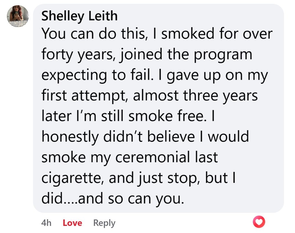 “You can do this, I smoked for over forty years, joined the program expecting to fail. I gave up on my first attempt, almost three years later I’m still smoke free. I honestly didn’t believe I would smoke my ceremonial last cigarette, and just stop, but I did….and so can you.”