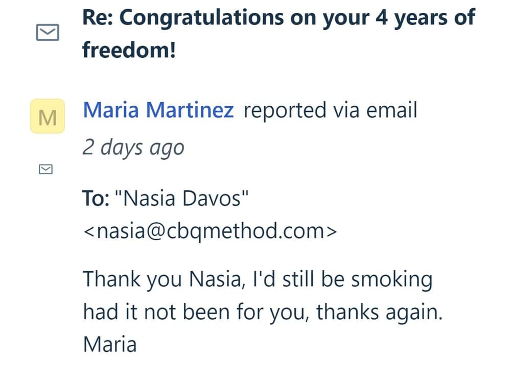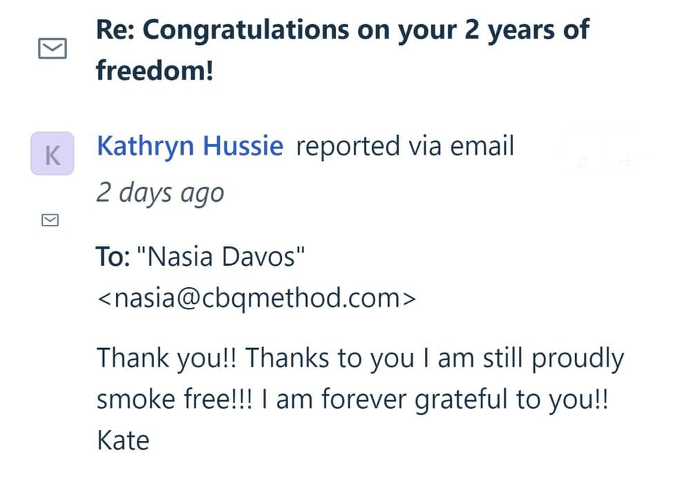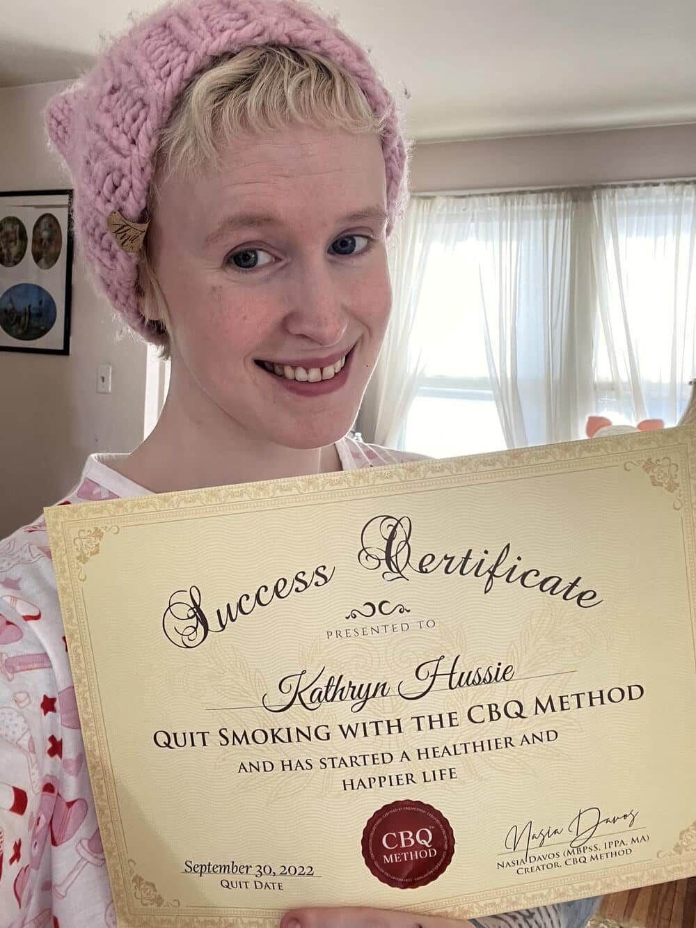 This week, CBQ Program member Kathryn Hussie from Pennsylvania, US celebrated 2 years smoke-free! Kathryn used to love smoking and tried to quit many times, but nothing really worked for her. One day she found the CBQ Method online and watched many of my YouTube videos before deciding to join the CBQ Program.