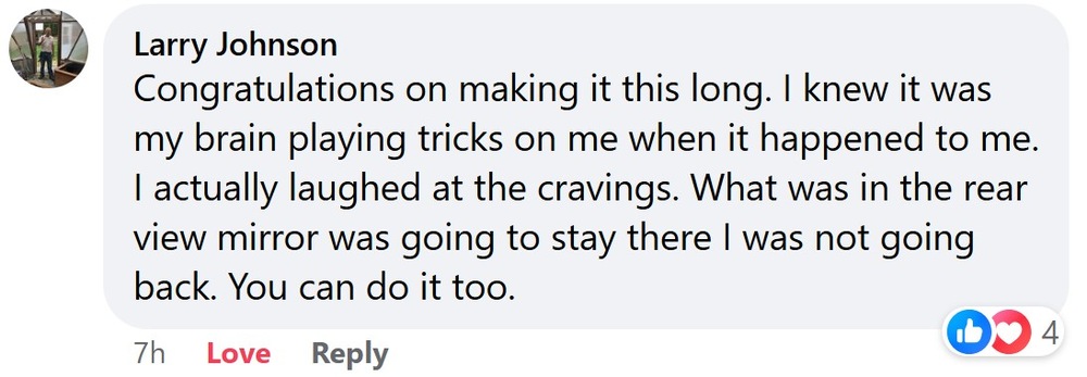 “Congratulations on making it this long. I knew it was my brain playing tricks on me when it happened to me. I actually laughed at the cravings. What was in the rear view mirror was going to stay there I was not going back. You can do it too.”