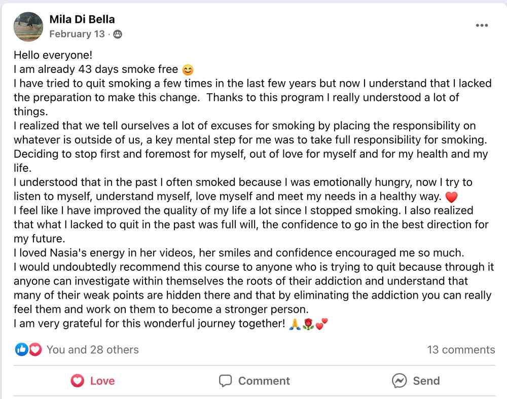 6 months later, Mila has NO thought or need around smoking. She is done!