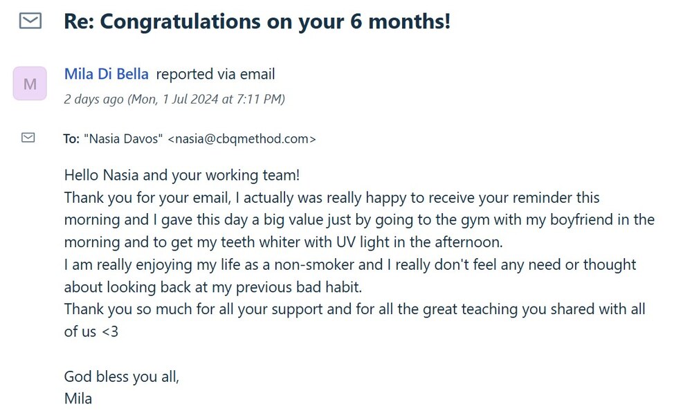 This week, CBQ Program member Mila Di Bella from Amsterdam, Netherlands celebrated 6 months smoke-free! Mila had tried to quit smoking many times. After attending the CBQ webinar, she realized what was missing from all her past attempts: preparation!