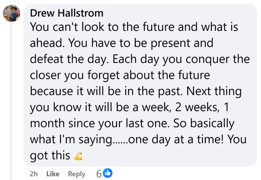 “You can’t look to the future and what is ahead. You have to be present and defeat the day. Each day you conquer the closer you forget about the future because it will be in the past. Next thing you know it will be a week, 2 weeks, 1 month since your last one. So basically what I’m saying……one day at a time! You got this”