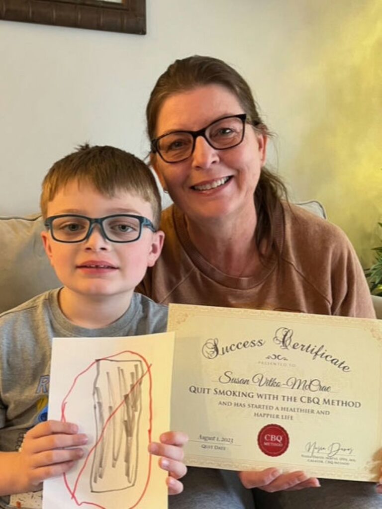 Susan shared: “I was a pack a day smoker for 35 yrs with several failed attempts to quit. When my grandson was born I told myself “I can quit for him”. When he was 5 yrs old I was still smoking and would try to hide it from him. He would see me and question why I was smoking and constantly tell me that it was bad and that I would die before I was suppose to. I was ashamed and told him I would try to quit but needed help, so he made me a no smoking sign. I was determined to be smoke free by his 6th birthday so once again I searched for help and was lead to the CBQ program.