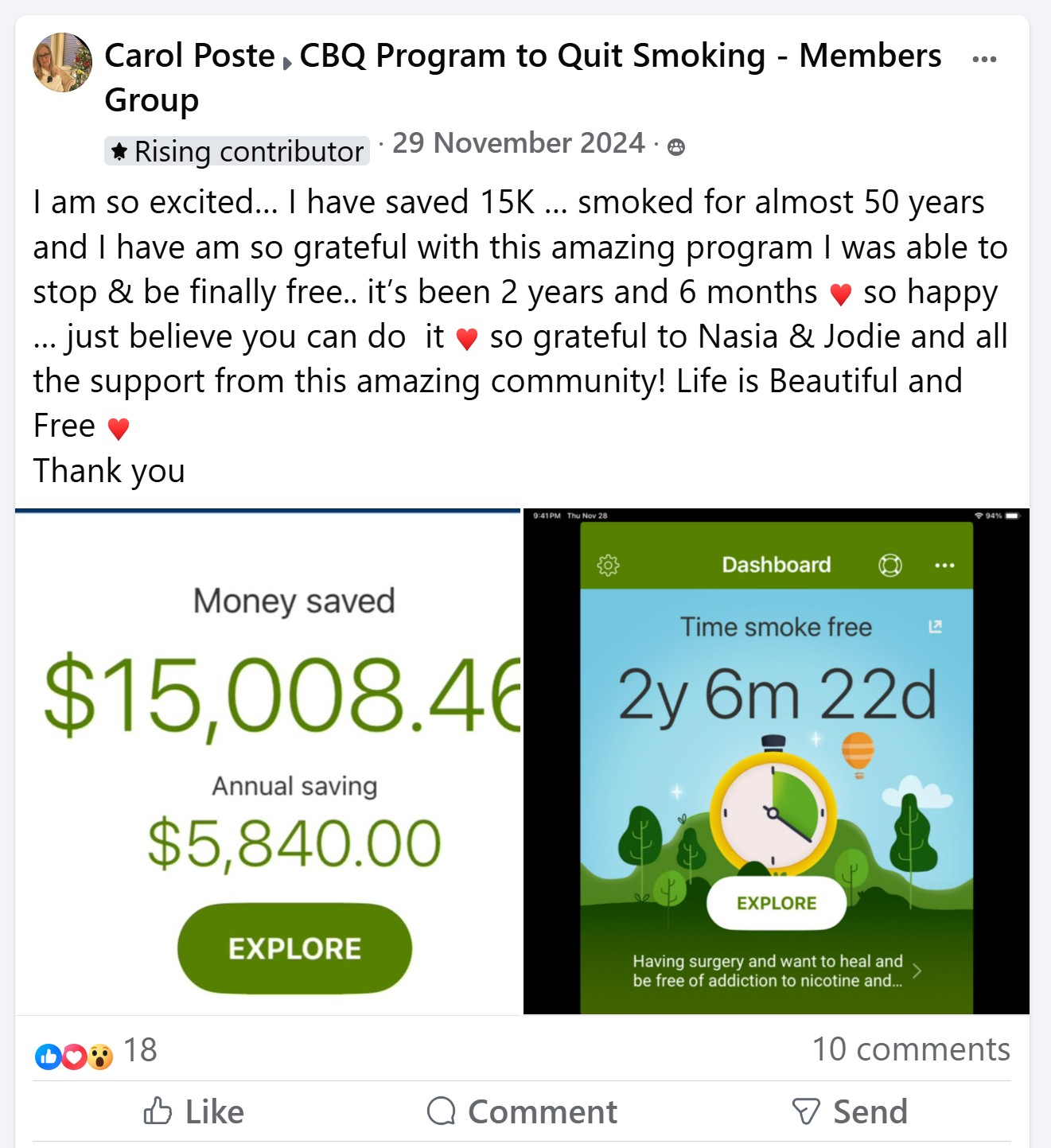 Since quitting smoking, Carol has had a successful surgery and has saved over 15,000 CAD. Incredible!