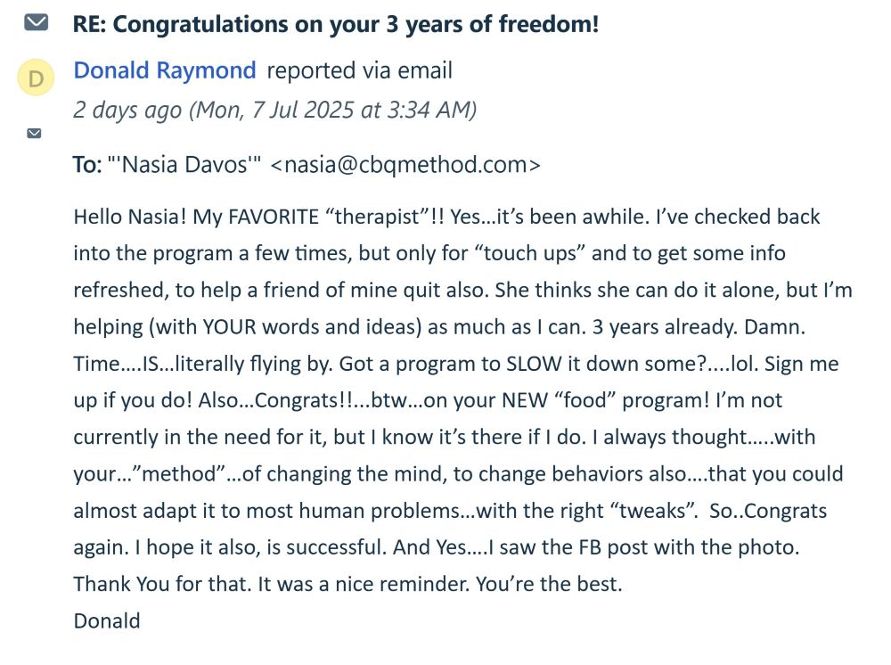 This week, CBQ Quit Smoking Program member Donald Raymond from Michigan, US, celebrated 3 years smoke-free.