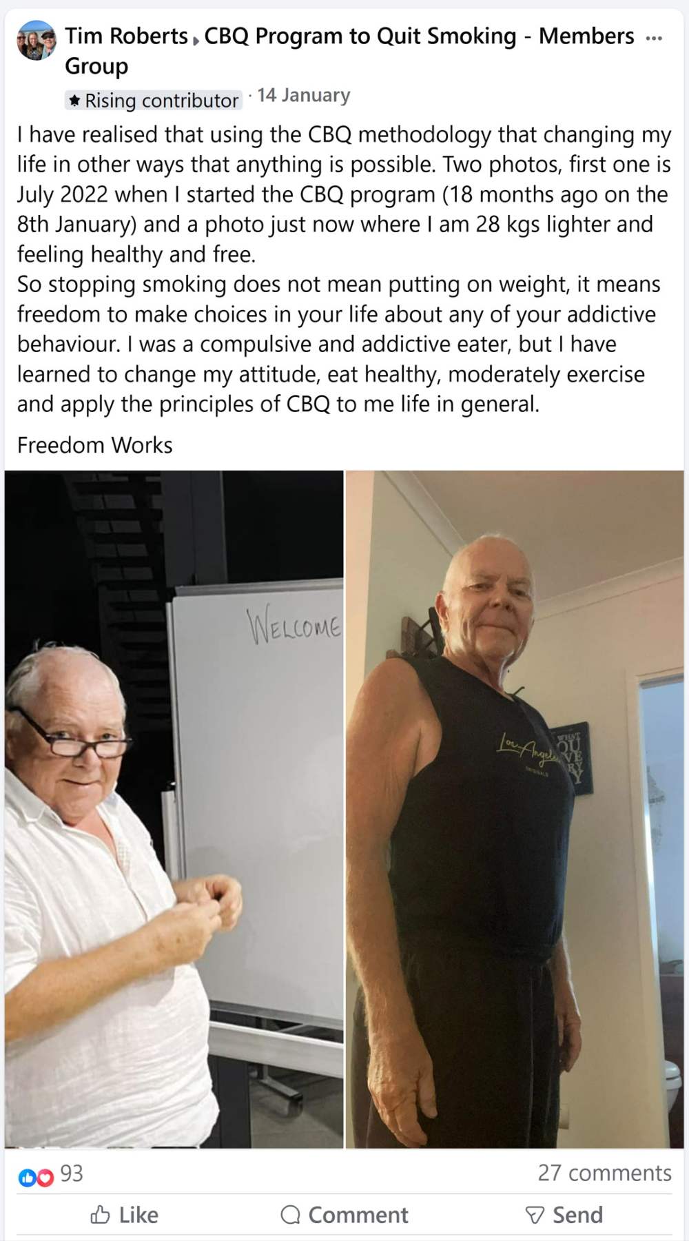 But after joining the CBQ Program, Tim became a happy non-smoker. He didn’t gain any weight after quitting smoking… Instead, he lost 28kg (60 pounds)!