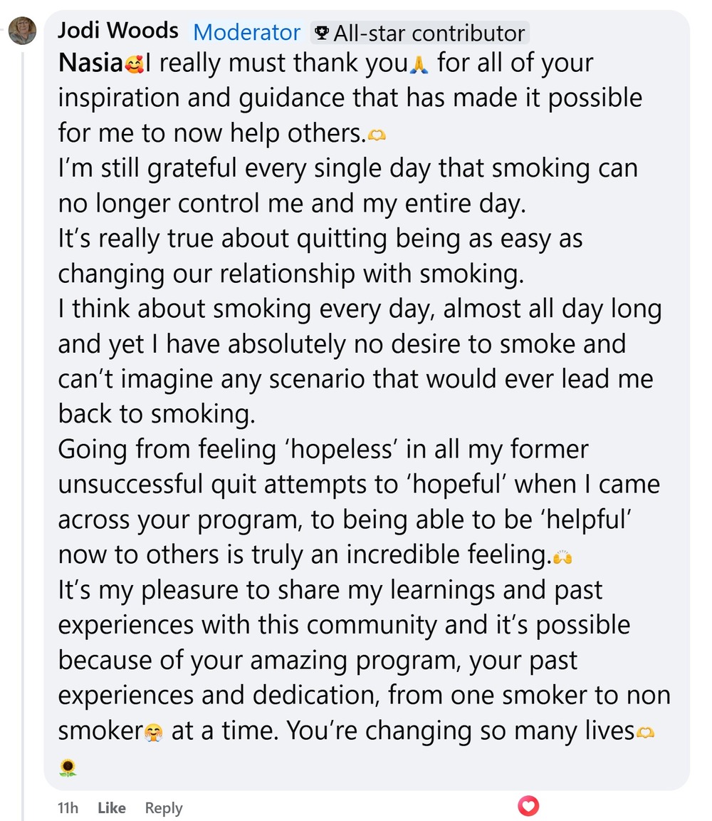 It’s my pleasure to share my learnings and past experiences with this community and it’s possible because of your amazing program, your past experiences and dedication, from one smoker to non smoker at a time. You’re changing so many lives”