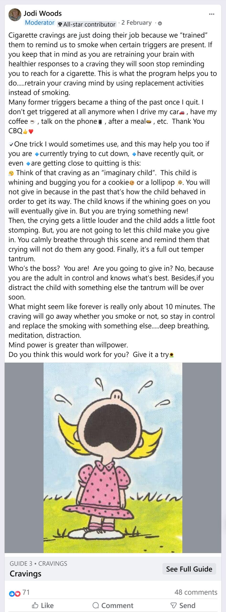 This week’s tip comes from CBQ Program member Jodi Woods who celebrated 5 years smoke-free this week! Jodi quit smoking on February 11, 2020. She’s now the moderator of the CBQ Program Members-Only Community, and over the last 5 years, she has helped thousands of members with her wisdom and insights. Her advice is always spot-on. Our community would just not be the same without her.