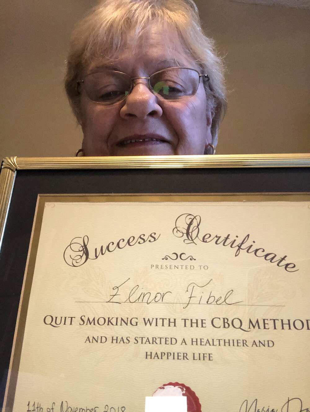 Two days ago, CBQ Program member Elinor Fibel from South Carolina, US, celebrated 6 years smoke-free! Elinor used to smoke 2 and a half packs a day for 55 years. She tried all stop smoking approaches – pills, nicotine gum, hypnosis and pure willpower – more than once.