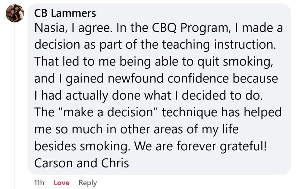 “In the CBQ Program, I made a decision as part of the teaching instruction. That led to me being able to quit smoking, and I gained newfound confidence because I had actually done what I decided to do. The “make a decision” technique has helped me so much in other areas of my life besides smoking. We are forever grateful! Carson and Chris”