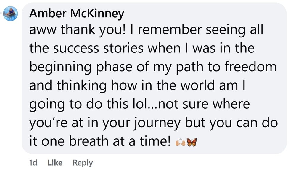 “I remember seeing all the success stories when I was in the beginning phase of my path to freedom and thinking how in the world am I going to do this lol…not sure where you’re at in your journey but you can do it one breath at a time!”