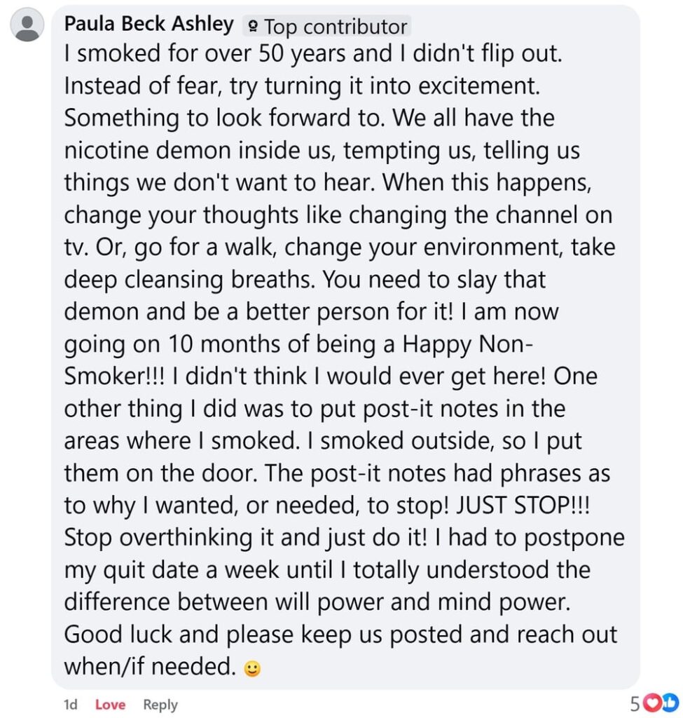 “I smoked for over 50 years and I didn’t flip out. Instead of fear, try turning it into excitement. Something to look forward to. We all have the nicotine demon inside us, tempting us, telling us things we don’t want to hear. When this happens, change your thoughts like changing the channel on tv. Or, go for a walk, change your environment, take deep cleansing breaths. You need to slay that demon and be a better person for it! I am now going on 10 months of being a Happy Non-Smoker!!! I didn’t think I would ever get here! One other thing I did was to put post-it notes in the areas where I smoked. I smoked outside, so I put them on the door. The post-it notes had phrases as to why I wanted, or needed, to stop! JUST STOP!!! Stop overthinking it and just do it! I had to postpone my quit date a week until I totally understood the difference between will power and mind power.”