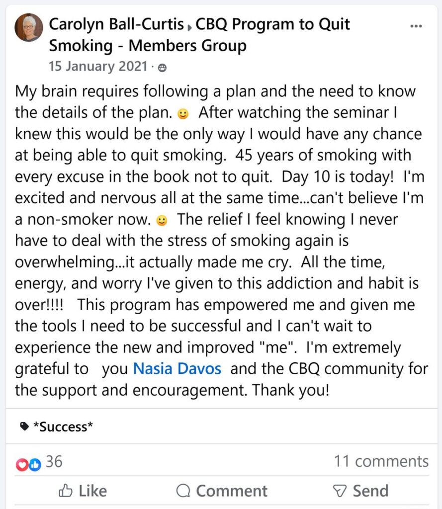 This is what Carolyn posted on her quit date (Day 10 of the CBQ Program)