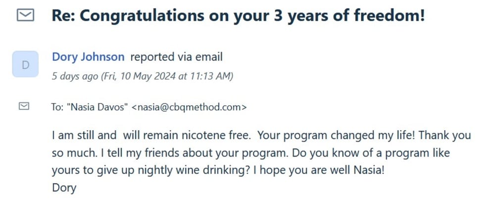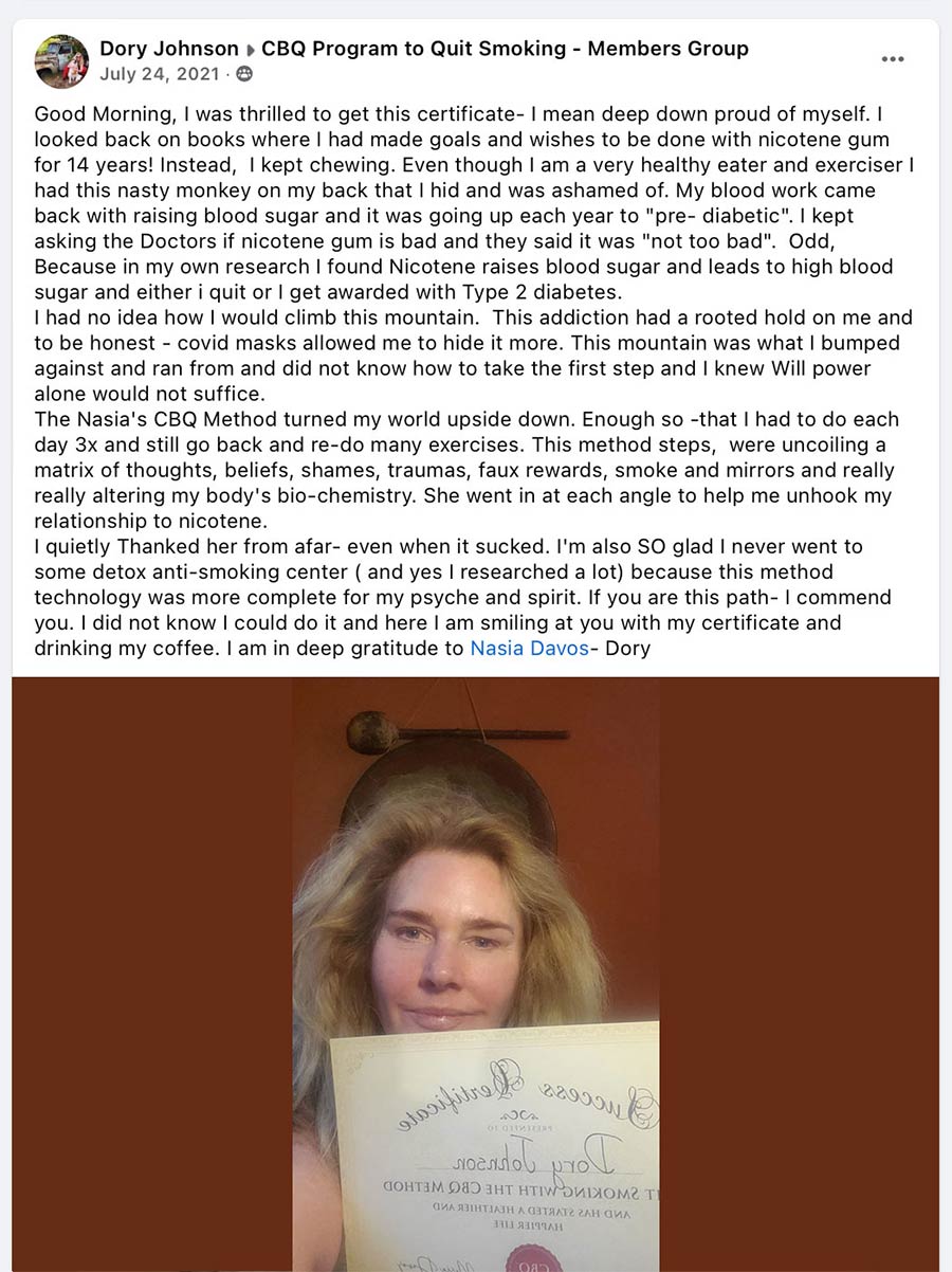 3 years ago, Dory came across the CBQ Program and decided to join. This changed everything for her. “CBQ Method turned my world upside down. This method steps, were uncoiling a matrix of thoughts, beliefs, shames, traumas, faux rewards, smoke and mirrors and really really altering my body’s bio-chemistry. She went in at each angle to help me unhook my relationship to nicotine.”