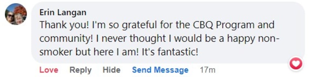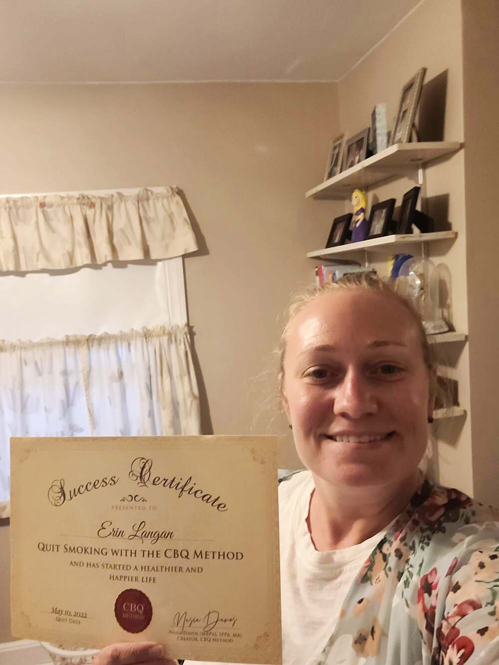 This is Erin with her CBQ Success Certificate that she shared hoping “it will help current smokers feel motivated to break free from their addiction.”