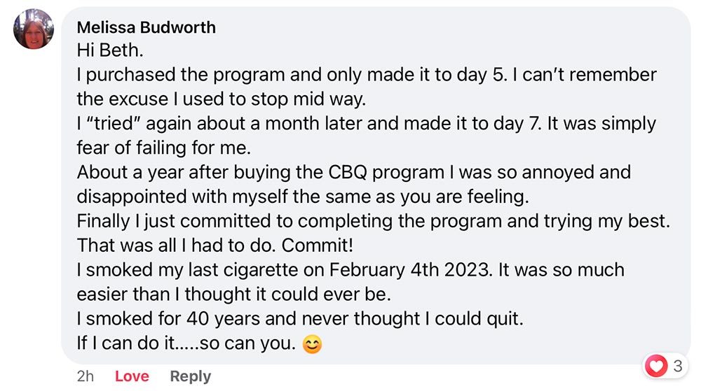 “I purchased the program and only made it to day 5. I can’t remember the excuse I used to stop mid way. I “tried” again about a month later and made it to day 7. It was simply fear of failing for me. About a year after buying the CBQ program I was so annoyed and disappointed with myself the same as you are feeling. Finally I just committed to completing the program and trying my best. That was all I had to do. Commit! smoked my last cigarette on February 4th 2023. It was so much easier than I thought it could ever be. I smoked for 40 years and never thought I could quit.