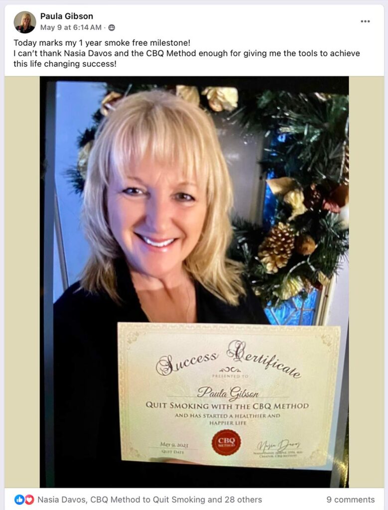 Since our last newsletter, CBQ Program member Paula Gibson from Ontario, Canada, celebrated 1 year smoke-free. Paula broke a 45-year addiction and completely transformed her relationship with smoking. When she was 4 months smoke-free, she lost her beloved mom and despite the grief and stress that came with this loss, Paula never turned to smoking because, as she told me, she had completely reprogrammed her mind. Paula knew smoking would do nothing to help her.