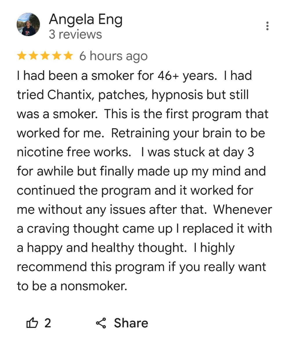 “I had been a smoker for 46+ years. I had tried Chantix, patches, hypnosis but still was a smoker. This is the first program that worked for me. Retraining your brain to be nicotine free works. I was stuck at day 3 for awhile but finally made up my mind and continued the program and it worked for me without any issues after that. Whenever a craving thought came up I replaced it with a happy and healthy thought. I highly recommend this program if you really want to be a nonsmoker.”