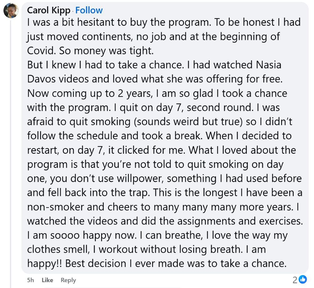 “I was a bit hesitant to buy the program. To be honest I had just moved continents, no job and at the beginning of Covid. So money was tight. But I knew I had to take a chance. I had watched Nasia Davos videos and loved what she was offering for free.” … “What I loved about the program is that you’re not told to quit smoking on day one, you don’t use willpower, something I had used before and fell back into the trap. This is the longest I have been a non-smoker and cheers to many many many more years. I watched the videos and did the assignments and exercises. I am soooo happy now. I can breathe, I love the way my clothes smell, I workout without losing breath. I am happy!! Best decision I ever made was to take a chance.”