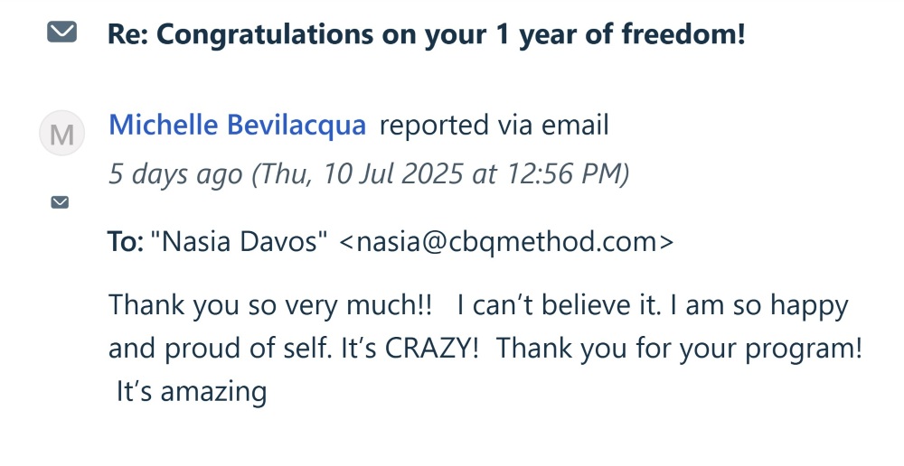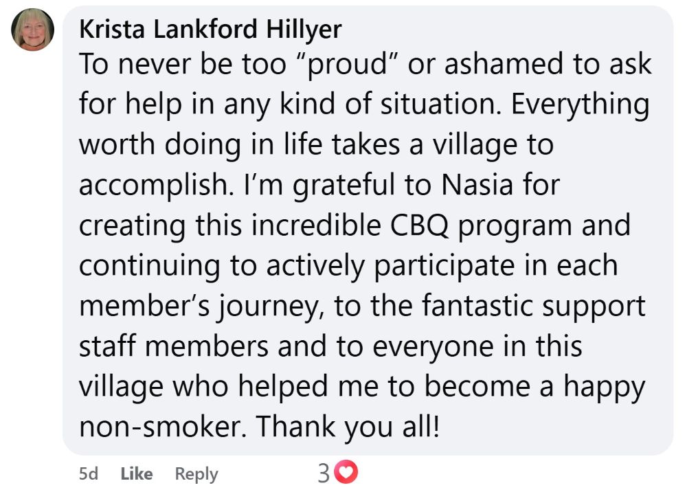 “To never be too “proud” or ashamed to ask for help in any kind of situation. Everything worth doing in life takes a village to accomplish. I’m grateful to Nasia for creating this incredible CBQ program and continuing to actively participate in each member’s journey, to the fantastic support staff members and to everyone in this village who helped me to become a happy non-smoker. Thank you all!”