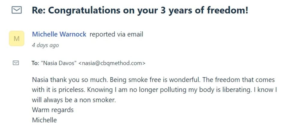 This week, CBQ Program member Michelle Warnock from Ontario, Canada, celebrated 3 years smoke-free!! 3 years ago, Michelle was worried about how she’d relieve stress without cigarettes, and could not imagine life without smoking. After struggling to quit on her own, Michelle found the CBQ Method and decided to join the CBQ program. She thought she had nothing to lose, and she was right: She quit!