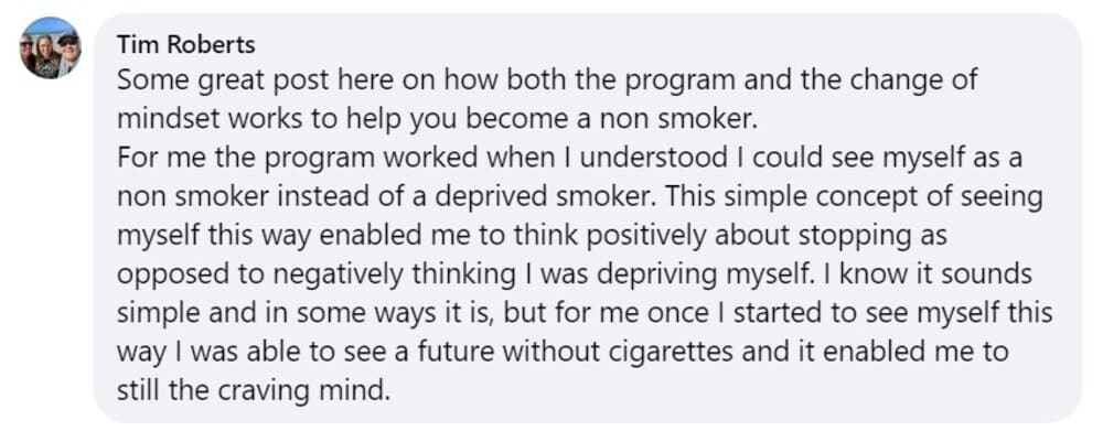 “For me the program worked when I understood I could see myself as a non smoker instead of a deprived smoker. This simple concept of seeing myself this way enabled me to think positively about stopping as opposed to negatively thinking I was depriving myself. I know it sounds simple and in some ways it is, but for me once I started to see myself this way I was able to see a future without cigarettes and it enabled me to still the craving mind.”
