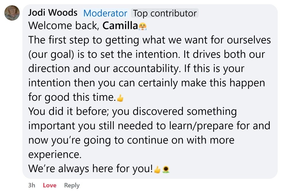 “The first step to getting what we want for ourselves (our goal) is to set the intention. It drives both our direction and our accountability. If this is your intention then you can certainly make this happen for good this time.