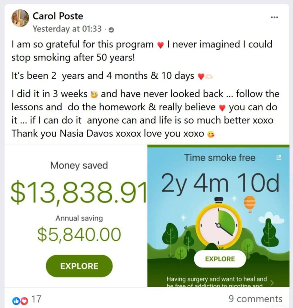 Despite being skeptical, Pauline did every exercise and every step outlined in the CBQ Program. By day 5 of the program, she felt excited to quit. By day 8, she couldn’t wait! She smoked her last cigarette on the 13th of September, 2019.