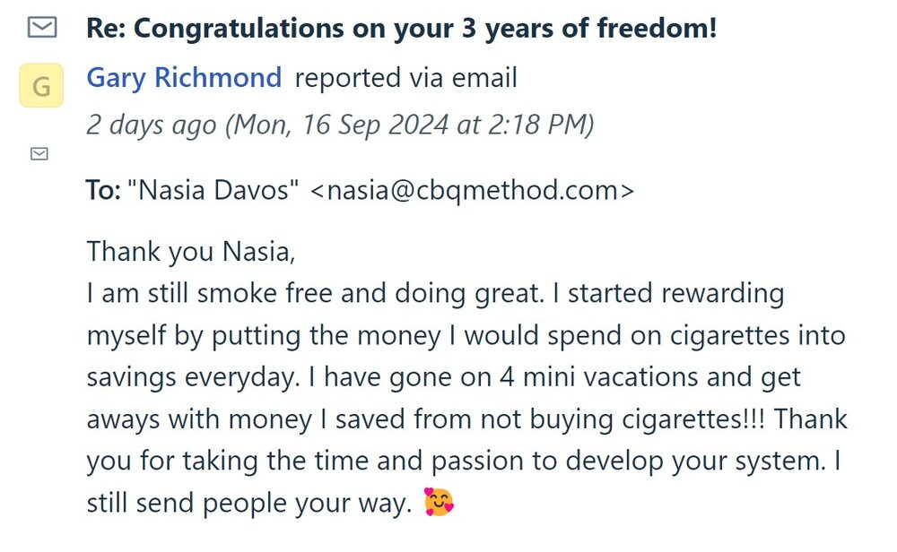 After coming across the CBQ Method, Gary decided to join the members’ program and give it a try. To his surprise, by day 10 of the program he could not smoke more than 2 cigarettes. He quit, and 3 years later, he’s still a happy non-smoker… who has saved over $10000 from not smoking.