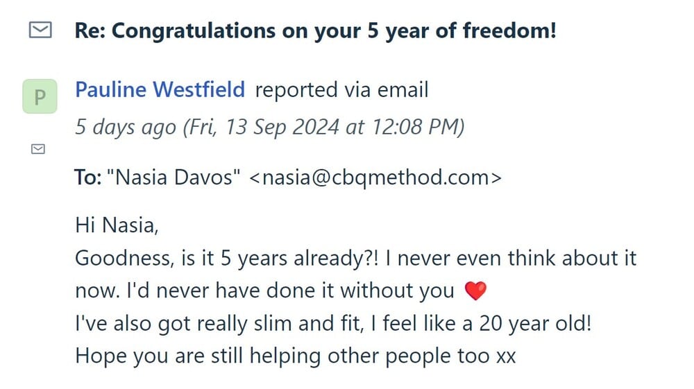 5 years later, Pauline is over 70 years old and feels like 20. Her inspiring journey started when she attended the free CBQ webinar 5 years ago.