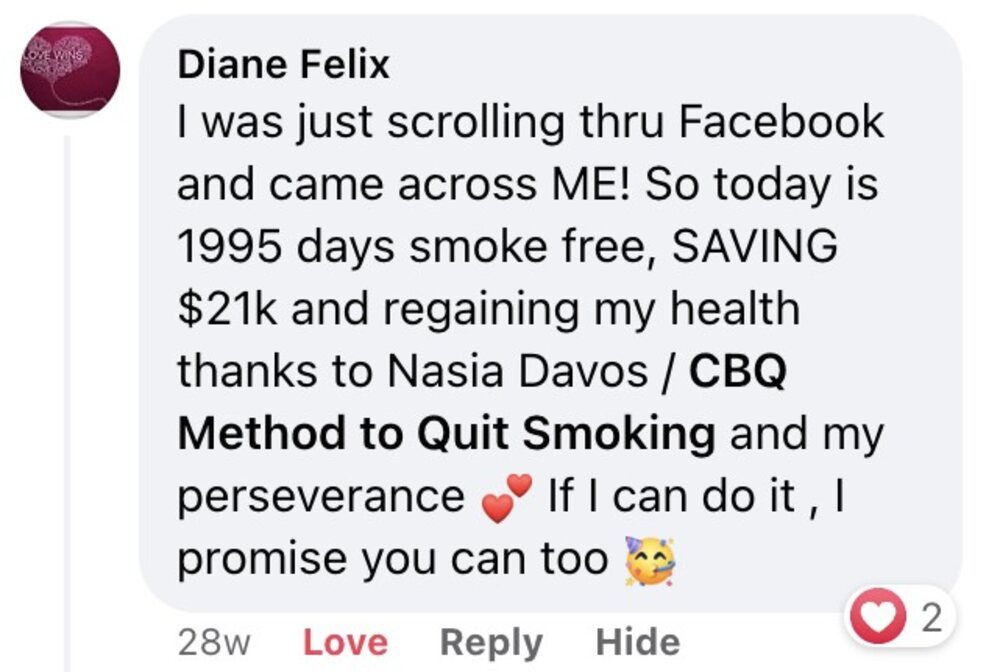 This week, CBQ Program member Diane Felix from Vermont, US, celebrated 6 years smoke-free. Diane used to smoke cigarettes and cigarillos. As Diane told me herself during her Ask An Ex interview, almost all her life, smoking felt like a friend and a way to cope with anxiety and pain – physical and mental. Diane has always been a very strong and independent woman, and she hated depending on cigarettes for everything. She wanted to quit, but nothing worked until one day she found the CBQ Program and decided to join. She committed fully to the process, and the rest is history. She quit on March 15, 2018.