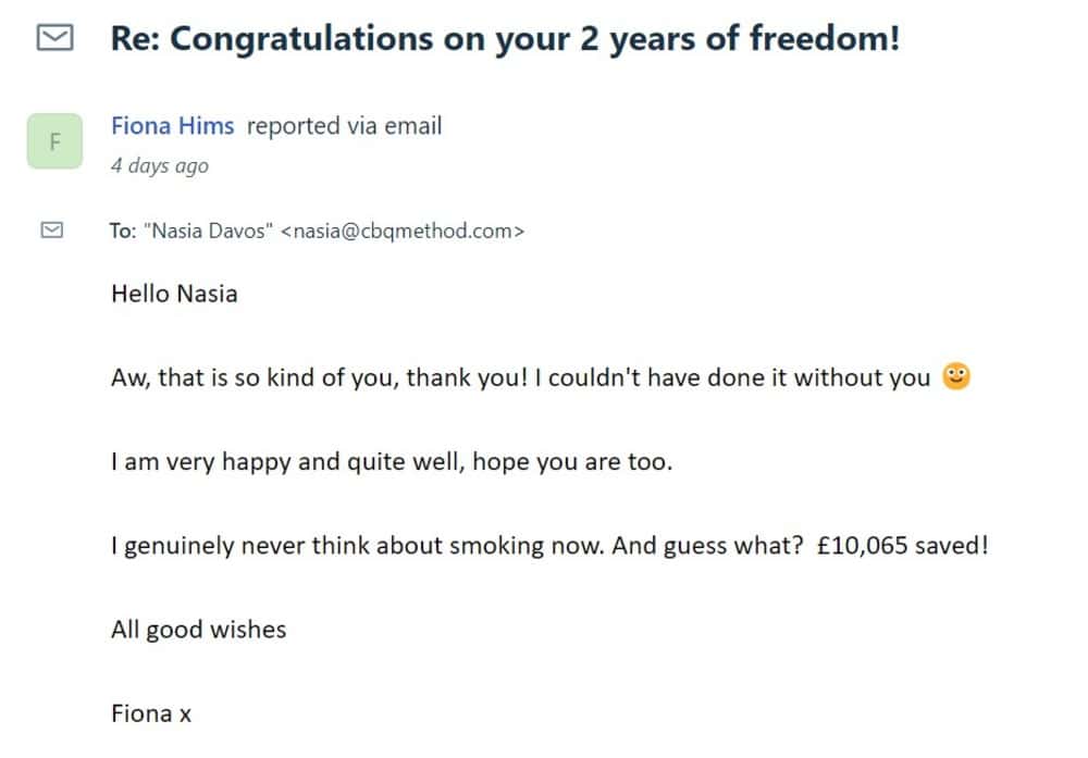 CBQ Program member Fiona Hims from Warwickshire, United Kingdom, celebrated 2 years smoke-free. In her own words “I quit smoking on 16 March 2022 and feel very proud of my achievement, having made numerous failed attempts to quit over many years!