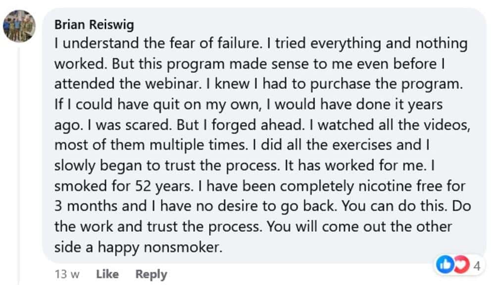 “I understand the fear of failure. I tried everything and nothing worked. But this program made sense to me even before I attended the webinar. I knew I had to purchase the program. If I could have quit on my own, I would have done it years ago. I was scared. But I forged ahead. I watched all the videos, most of them multiple times. I did all the exercises and I slowly began to trust the process. It has worked for me. I smoked for 52 years. I have been completely nicotine free for 3 months and I have no desire to go back. You can do this. Do the work and trust the process. You will come out the other side a happy nonsmoker.”