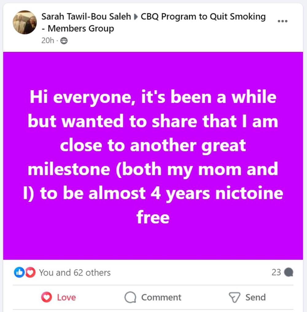This week CBQ Program member Sarah Tawil from New York, US, shared with our members group that she and her mom are both nearing 4 years completely nicotine-free!