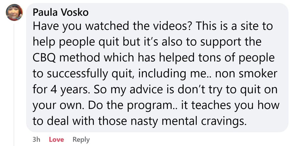 “Have you watched the videos? This is a site to help people quit but it’s also to support the CBQ method which has helped tons of people to successfully quit, including me.. non smoker for 4 years. So my advice is don’t try to quit on your own. Do the program.. it teaches you how to deal with those nasty mental cravings.”
