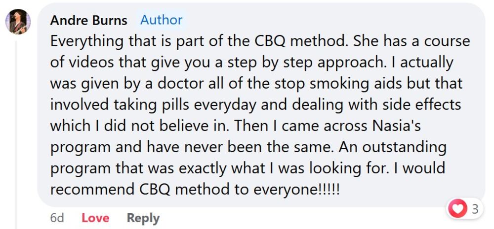 As he said, “Everything that is part of the CBQ method. She has a course of videos that give you a step by step approach. I actually was given by a doctor all of the stop smoking aids but that involved taking pills everyday and dealing with side effects which I did not believe in. Then I came across Nasia’s program and have never been the same. An outstanding program that was exactly what I was looking for. I would recommend CBQ method to everyone!!!!!”