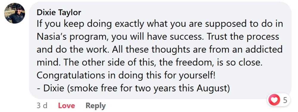 “If you keep doing exactly what you are supposed to do in Nasia’s program, you will have success. Trust the process and do the work. All these thoughts are from an addicted mind. The other side of this, the freedom, is so close. Congratulations in doing this for yourself!