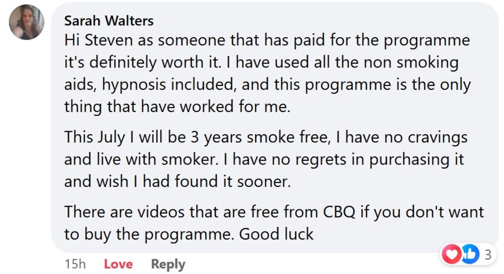 Three days ago, the inspiring CBQ Program member Sarah Walters from England, UK, celebrated 3 years smoke-free. Sarah was a smoker for 26 years. For many of those years, she tried to quit multiple times with stop smoking approaches from nicotine gums and patches to hypnosis and everything in between. Nothing worked. After attending the free CBQ webinar, Sarah knew the CBQ Method could work for her and decided to join the CBQ Program. She committed to the process with an open mind, did her best… and the rest is history!