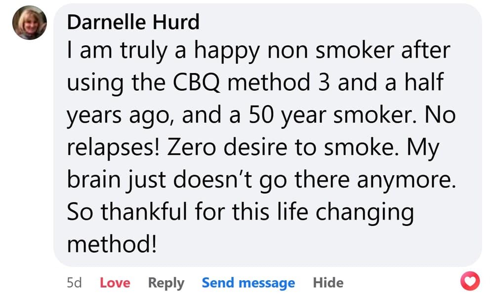 “I was frustrated that all the doctors say “quit smoking” but offer no help or suggestions. I am very impressed with this program and very grateful I discovered it. I love the wealth of information, the videos, the cigarette log, the Facebook group and everything about the program.