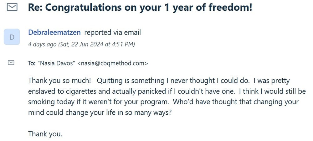 “Thank you so much! Quitting is something I never thought I could do. I was pretty enslaved to cigarettes and actually panicked if I couldn’t have one. I think I would still be smoking today if it weren’t for your program. Who’d have thought that changing your mind could change your life in so many ways?”